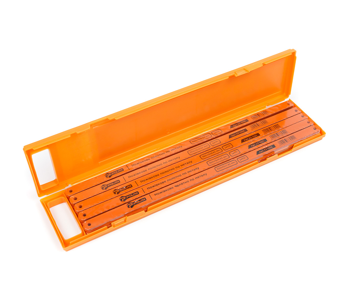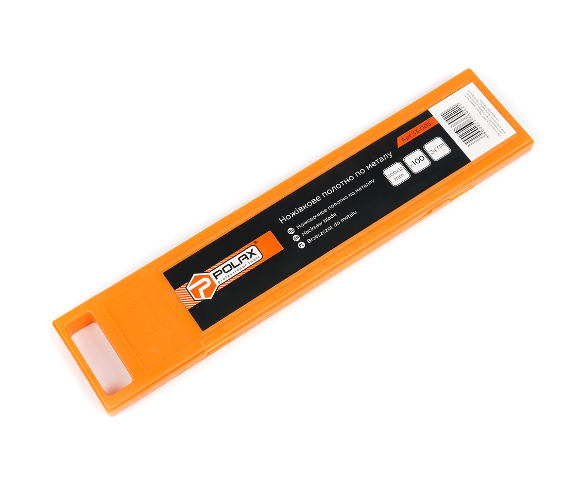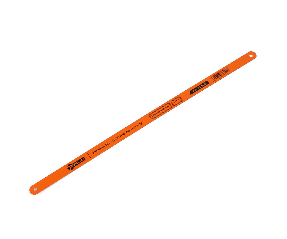 Ножівкове полотно по металу Polax 300 х12 х 0.5 мм, 24TPI, 100 шт. (33-005). Коли справа стосується різання металу, якість інструменту відіграє ключову роль. Ножівкове полотно Polax 300 х12 х 0.5 мм - це надійний вибір для професійних завдань, який справляється з різкою металу легко і точно. Давайте докладніше розглянемо його характеристики.Розмір леза 300 х 12 х 0.5 мм: Це ножівкове полотно має оптимальні розміри для ефективного різання металу. Тонка сталева пластина з двома отворами забезпечує міцність і надійність. Твердість матеріалу на рівні HRC 61-64 гарантує довговічність і стійкість полотна. Ви можете бути впевнені, що воно прослужить вам довгий час. Полотно обладнане 24 зубцями на дюйм, що забезпечує точне і чисте виконання різання. Ви зможете отримати професійні результати в кожному проекті.Наше ножівкове полотно призначене для професійних завдань. У рамці пильні полотна вставляються зубами вперед, і в процесі різання робляться два ходи: робочий і холостий. Правильна експлуатація забезпечує довгий термін служби інструменту.